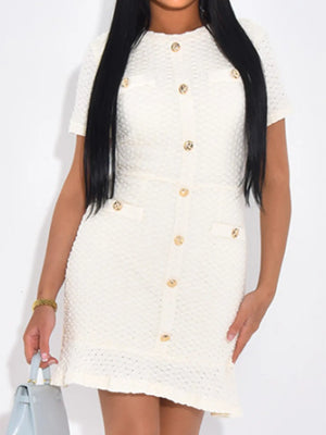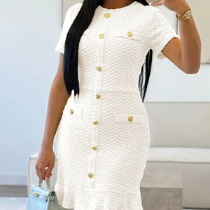 Effortless polish in one step. This long-line dress is tailored from a premium, mid-weight micro-peached twill that drapes like silk but travels like cotton. Short, crisp sleeves and a neat shirt-tail hem keep the look boardroom-clean, while the full-length button placket lets you decide how much leg to reveal—wear it fully closed for column-silhouette drama, or leave the last three undone for front-slit movement.